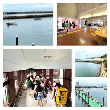 渡り廊下を通って別棟に移動。渡り廊下からは、透き通る海と、これから出港するカッターが見えて、子どもたちから思わず声が上がります。この後の活動に期待が膨らみます。