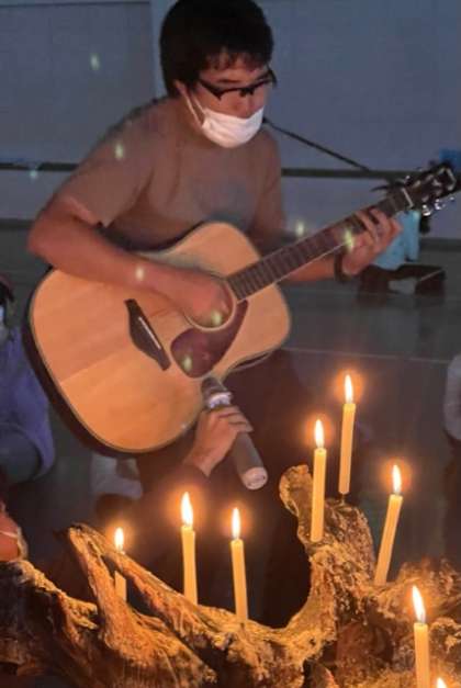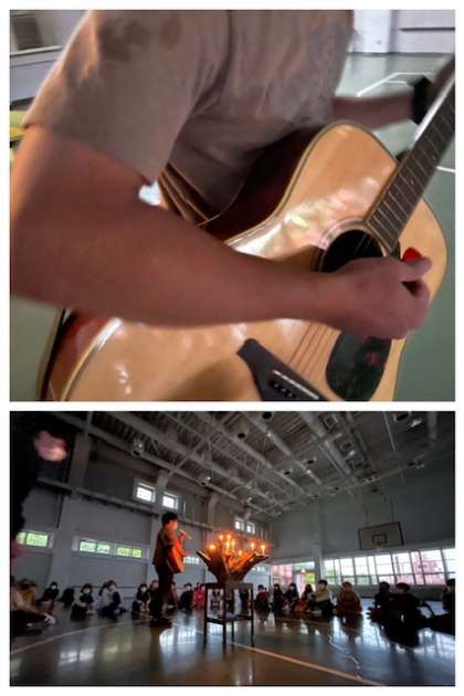 黒縁メガネをかけた人物がギター片手に調子外れのカエルの歌を歌います。神聖ムードが一変、笑いと歓声に包まれます。