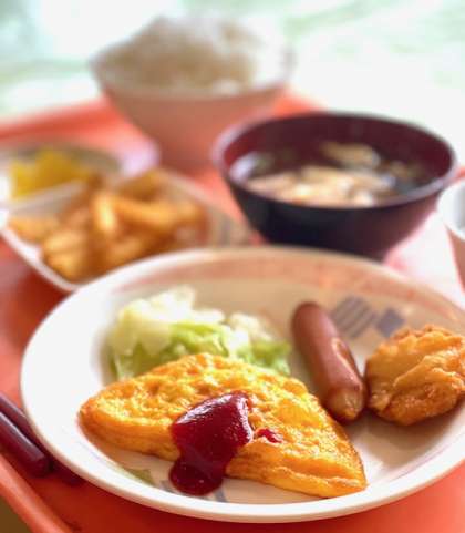 朝食は、オムレツ、ナゲット、ウインナー、ポテトフライ、キャベツ、たくあん、みそ汁、ごはんです。