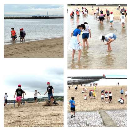 シェルアートに使う貝殻を集め、早く集め終えたら生き物探し、ビーチフラッグなどをして遊びます。
