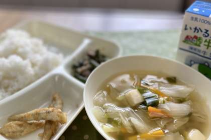 今日の五目汁の具材は、とうふ、キャベツ、たまねぎ、にんじん、あおねぎ、の5つです。だしの風味が豊かで、野菜もたくさん摂ることができます。この他、いろいろな具材で「五目汁」が作れそうですね。