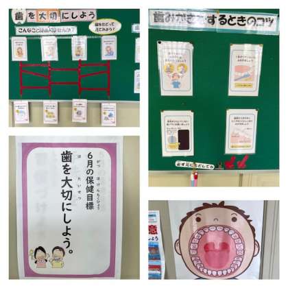 6月の保健目標は、「歯を大切にしよう」です。保健室前には、歯磨きに対する意識を高めるための掲示が掲出されています。歯のいろいろな部分をしっかり磨くために、磨き方も工夫が必要です。掲示した顔を使って、本物の歯ブラシで練習できるようにしています。