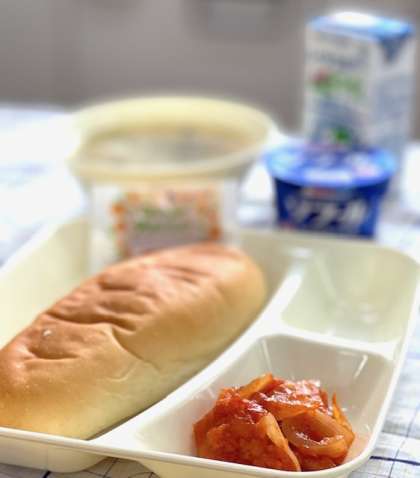 今日の献立は【えびのチリソース・中華スープ・ヨーグルト・コッペパン・アプリコットジャム・牛乳】です。