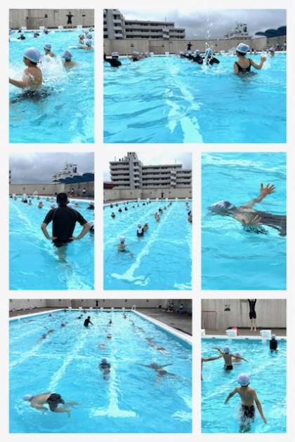 今朝はまとまった雨が降る時間帯もありましたが、9時ごろからは雨があがり、2年生はプールに入ることができました。今年初めての水泳で、子どもたちはとても楽しそうでした。水慣れを行い、体を浮かす練習をします。これが今後の泳ぎの習得につながって行きます。ダルマ浮き、大の字浮きなどをして、けのびにつなげていきます。