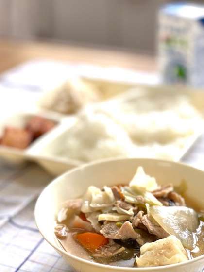 中華煮は、豚肉・たけのこ・にんじん・たまねぎ・キャベツ・ニラが入った、具沢山の献立です。中華スープで味付けをして、でんぷんでとろみをつけています。野菜を美味しく食べることができる献立です。