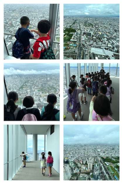 到着時は眼下に雲がたなびいていましたが、みるみるうちに視界が晴れてきて、このような眺めとなりました。子どもたちは、自分が調べたいと思っていたものを見つけ、大阪の土地利用の様子をしっかり観察することができていました。