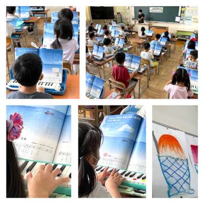 1年生は、音楽の時間に「鍵盤ハーモニカ」の練習をしました。黒板に鍵盤の掲示物を貼り付けて、どの鍵盤がどの音を表すかを確かめます。とても上手に音を鳴らしていました。たくさんの曲を弾けるようになって欲しいです。