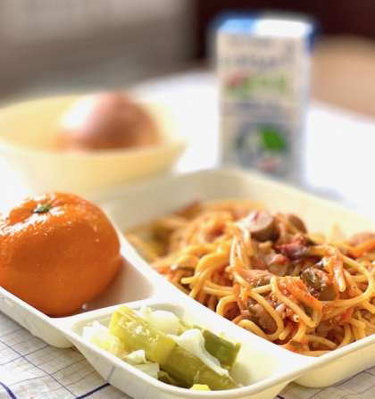今日の献立は【チキントマトスパゲッティ・グリーンアスパラガスとキャベツのサラダ・みかん(冷凍)・1/2こくとうパン・牛乳】です。