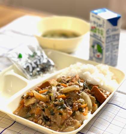 今日の給食は【マーボーあつあげ丼・中華スープ・ミニフィッシュ・牛乳】です。マーボーあつあげ丼は、食べ応えがある一品です。ボリュームがあって、満足度が高いです。野菜がふんだんに使われているのも良いですね。