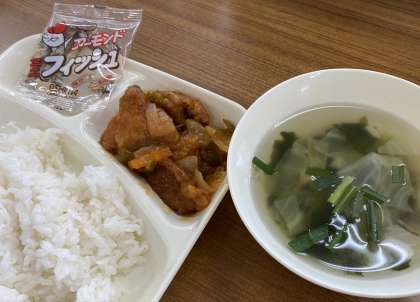 中華スープは、たけのこ、わかめ、キャベツ、にらが入っており、シャキシャキとした食感です。さっぱりとしているので、今日の酢豚ととても合います。まだまだ暑さが続いていますが、しっかり食べて元気に過ごしてほしいと思います。
