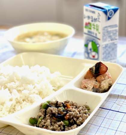 今日の献立は【さけのつけ焼き・五目汁・高野どうふのいり煮・ごはん・牛乳】です。