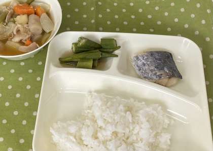 今日の献立は【さごしの塩焼き、豚肉とじゃがいもの煮もの、オクラのいためもの、ごはん、牛乳】です。今日のオクラは炒めた後にみりんやしょうゆで味をつけ、あっさりと食べやすく作られています。ネバネバ食材は体に良いと言われていますので、しっかり食べてこの暑さを乗り切ってほしいと思います。