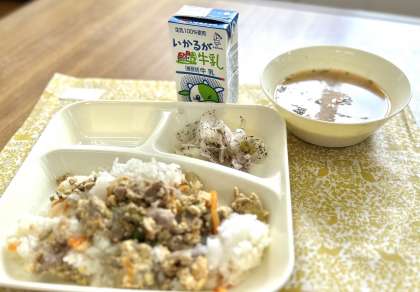 今日の献立は【他人丼、とうがんのみそ汁、キャベツの赤じそあえ、牛乳】です。今日のみそ汁は、とうがんとうすあげを使っています。また、赤みそと白みそで味つけをしているので、いつもよりもコクが感じられました。