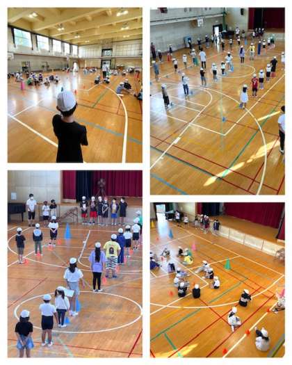 今日は「児童集会」の日。体育館で学年を超えた縦割り班に分かれて活動します。コロナ禍では、全校児童が一斉に体育館に集まるのではなく、班によって日を分けて実施しています。