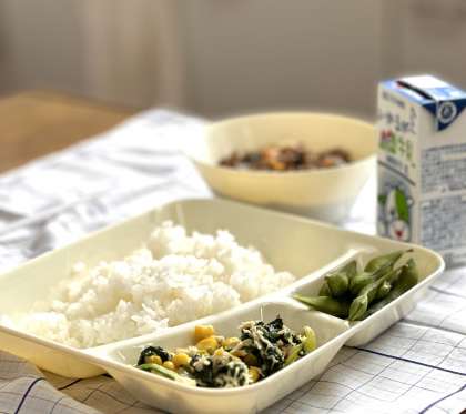 今日の献立は【マーボーなす、チンゲンサイとコーンのいためもの、えだまめ、ごはん、牛乳】です。チンゲンサイの旬は、気温が下がってくる今頃から12月頃です。また、コーンの旬は夏から今頃。いろどりがよいだけでなく、旬のものを使ったメニューとなっています。