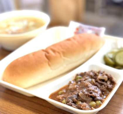 今日の給食は【牛肉のデミグラスソース煮、スープ、きゅうりのピクルス、いちごジャム、コッペパン、牛乳】です。