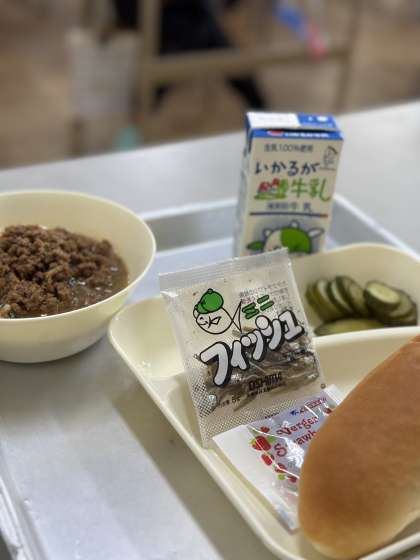 タンタンめんは元々中国の辛味を利かせた麺料理ですが、今日の給食では甘辛く炊いたひき肉をのせ、食べやすく辛くない味に仕上がっています。今日もおかわりする児童がたくさんいました。