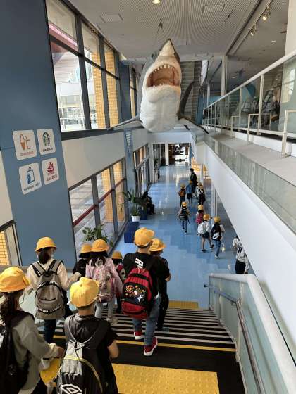 強風の中、おいしいお弁当を食べた後は『海遊館アカデミー』の時間。飼育員さんから、海の生き物が水の抵抗をあまり受けずに泳ぐ秘密について教わりました。
