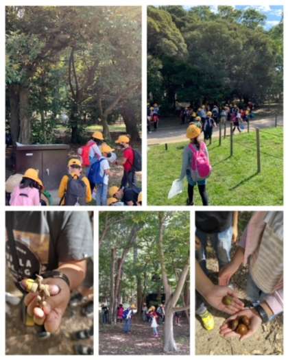 長居公園について、まずは「秋みつけ」をしました。公園入口付近はもちろん、植物園にもどんぐりがいっぱいありました。子どもたちは、大きなどんぐりや、かさのついたどんぐりを見つけて大喜び。