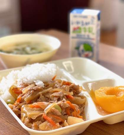 今日の献立は【ピリ辛丼・中華スープ・黄桃(缶)・牛乳】です。
