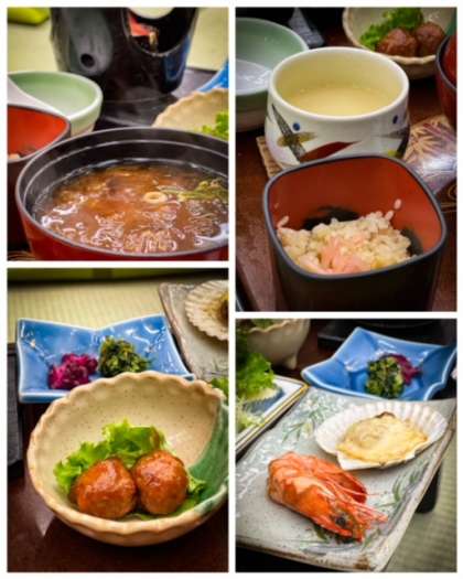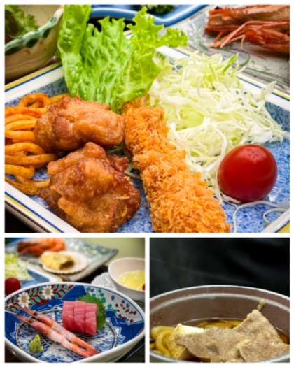 すき焼き、お刺身、エビフライ、唐揚げ、茶碗蒸しなど、豪華な晩ご飯です。味もとっても美味しいです。