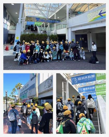 鳥羽水族館に到着。学年で記念撮影をして、館内に入ります。