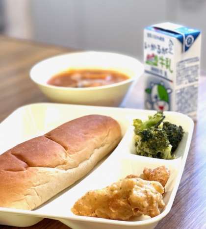 今日の献立は【白身魚のフリッター・ミネストローネ・ブロッコリーのサラダ・こくとうパン・牛乳】です。