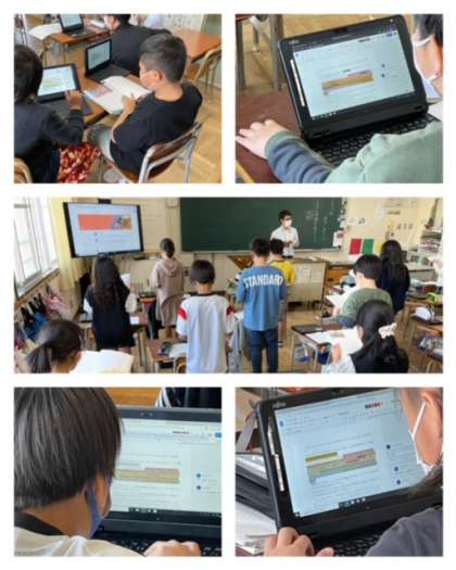 小路小学校では、ICTを活用した授業研究に取り組んでいます。写真は、先週4年生が取り組んだICT活用の様子です。一人一台端末により、個別の学習ができるようになりましたが、ウェブ上で考えを共有できるツールを使い、友だちの意見も見ることができるようになっています。