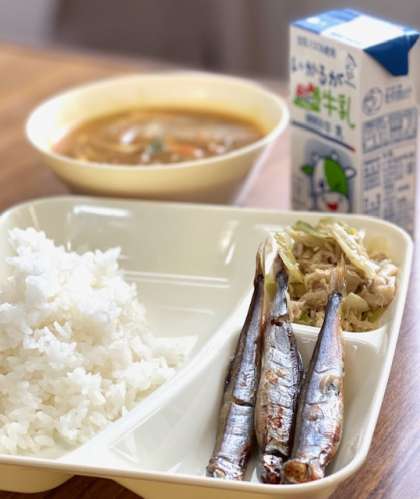 今日の献立は【焼きししゃも・和風カレー汁・まいたけとキャベツのいためもの・ごはん・牛乳】です。