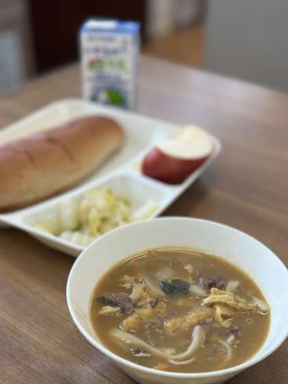 今日の献立は【カレーうどん、はくさいのおひたし、りんご、こくとうパン、牛乳】です。