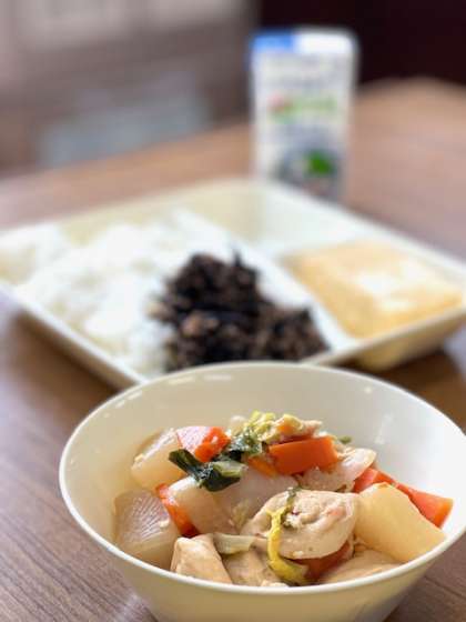 今日の献立は【一口がんもと野菜の煮もの・たまごどうふ・魚ひじきそぼろ・ごはん・牛乳】です。