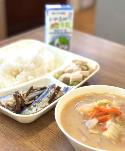 この日の献立は【いわしのしょうが煮、みそ汁、高野どうふの煮もの、ごはん、牛乳】でした。