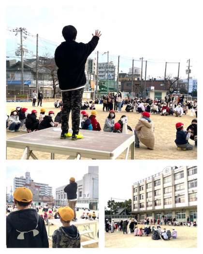 今日は全児童が運動場へ出て、縦割り班でゲームを楽しむ「児童集会」の日です。今日のゲームは「じゃんけんゲーム」。司会の児童とジャンケンをしますが、各班でグー、チョキ、パーのどれを出すか相談してからジャンケンをします。勝つ班と負ける班で悲喜こもごもの反応ですが、勝っても負けても班の交流と絆は深まったことと思います。