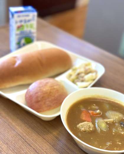 この日の献立は【ミートボールと野菜のカレー煮、ツナとキャベツのソテー、りんご、黒糖パン、牛乳】でした。