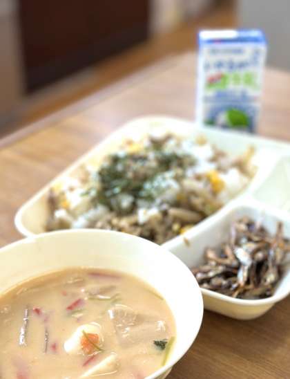 今日の献立は【きんぴらちらし、ぞう煮、ごまめ、牛乳】正月の行事献立です。ごまめは『豊作を願う』など、新年を祝う