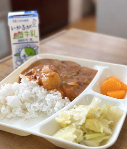 今日の献立は【ハヤシライス、キャベツのバジル風味サラダ、みかん(缶)、牛乳】です。