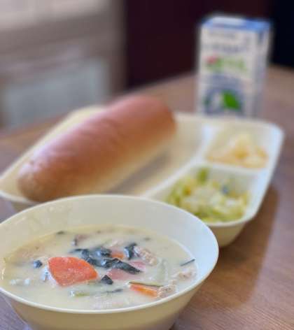 2/21の献立は【ほうれんそうのクリームシチュー・キャベツのサラダ・洋なし(カット缶)・黒糖パン・牛乳】です。