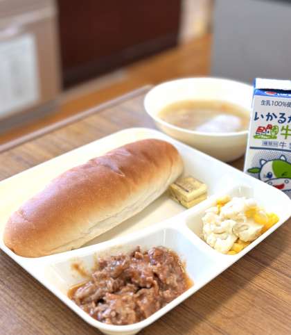 3/20の献立は【豚肉のデミグラスソース、スープ、カリフラワーとコーンのサラダ、バター、コッペパン、牛乳】です。
