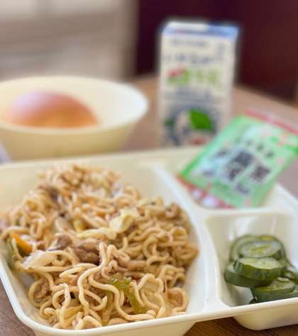 焼きそばは子どもたちに人気のメニューのひとつ。焼きそばやスパゲッティなどの麺類の時には、小さなコッペパンがひとつ提供されます。これは、学校給食が必要カロリーや栄養素などが細かく規定されていることによるものです。