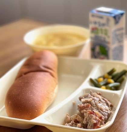 給食には、2つの食器を使います。お椀には汁物、3区画に分かれたお皿には、パン(ごはん)とおかず2品(1品が果物やデザートのことも)を盛り付けます。