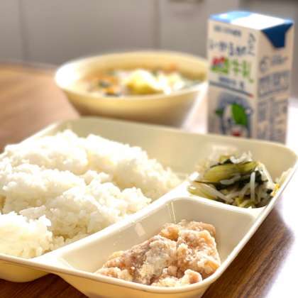 今日の献立は【鶏肉のからあげ・中華スープ・チンゲンサイともやしの甘酢あえ・ごはん・牛乳】です。