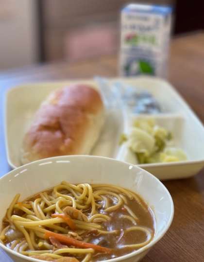 今日の献立は【カレースープスパゲッティ・キャベツのピクルス・ミニフィッシュ・おさつパン・牛乳】です。