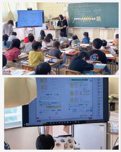 電子黒板にはデジタル教科書を表示。ICTが導入される前には教員が声で子どもたちに指示をしていましたが、実際のページを表示しながら授業を進められることは、ICT活用による大きな成果のひとつです。