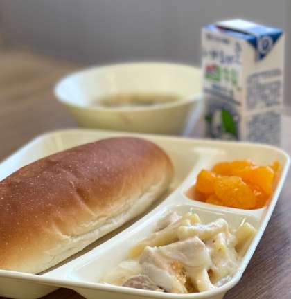 今日の献立は【マカロニグラタン・キャベツのスープ・みかん(缶)・コッペパン・いちごジャム・牛乳】です。
