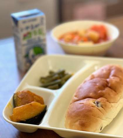 5/9の献立は【ケチャップ煮・さんどまめとコーンのソテー・焼きかぼちゃの甘みつかけ・おさつパン・牛乳】です。