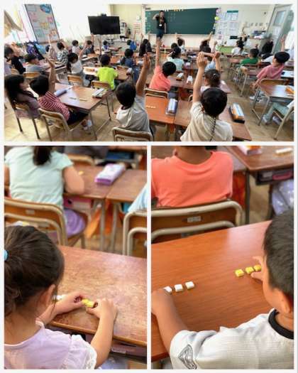 1年生は、ブロックを使って数字の学習。ブロックは、実際に手に取って数えることができるので、「6は5より1大きい」といった数字の概念を身につけるのに効果的です。