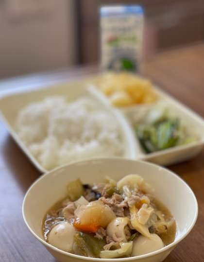 今日の献立は【八宝菜・チンゲンサイともやしのしょうがあえ・パインアップル(カット缶)・ごはん・牛乳】です。今日は中華風の献立です。八宝菜は、「豚肉・たけのこ・しいたけ・にんじん・たまねぎ・ピーマン・キャベツ・うずら卵」の計8種類の具材が含まれており、野菜もたっぷり摂ることができるようになっています。旬の味覚「たけのこ」も使われています。