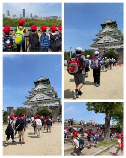 天守閣に近づくと、その立派さがさらによく分かります。城壁跡の高台から大阪の街を眺めます。大阪市内で一番標高が高い土地からの眺めは抜群ですが、子どもたちはそれ以上に本丸内の階段が急であることに驚いていました。