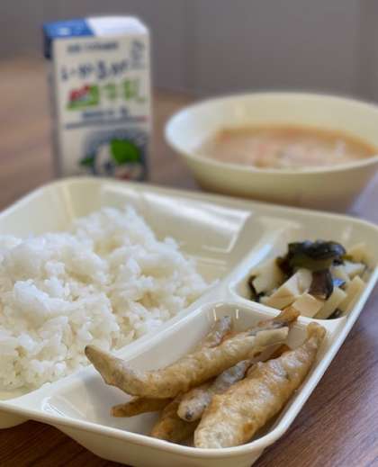 5/24の献立は【きびなごてんぷら・豚汁・わかたけ煮・ごはん・牛乳】です。今日は、春の味覚「わかたけ煮」が登場。出汁の香りと筍のコリコリとした食感がとても美味しいです。