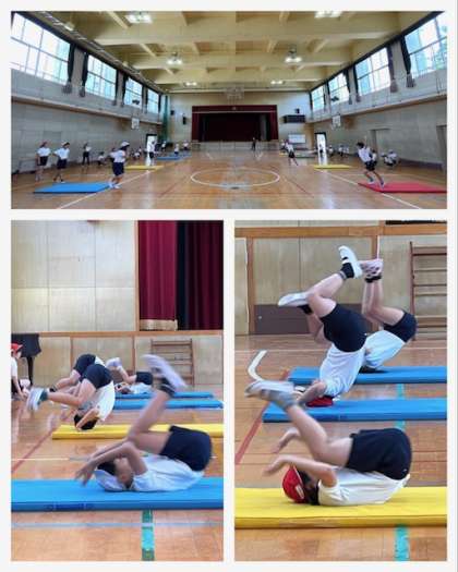 前転をする際、「指をしっかりと伸ばして掌をつく」、「頭は頭頂部より後ろをマットにつく」といった基本的なことをしっかりと押さえて、美しいフォームで回ることができるように何度も練習をしていました。正しいフォームで回ることは、事故防止の観点からも大切なことです。難易度の高い技にチャレンジする前に、基本の技を正しいフォームで回れるように指導しています。